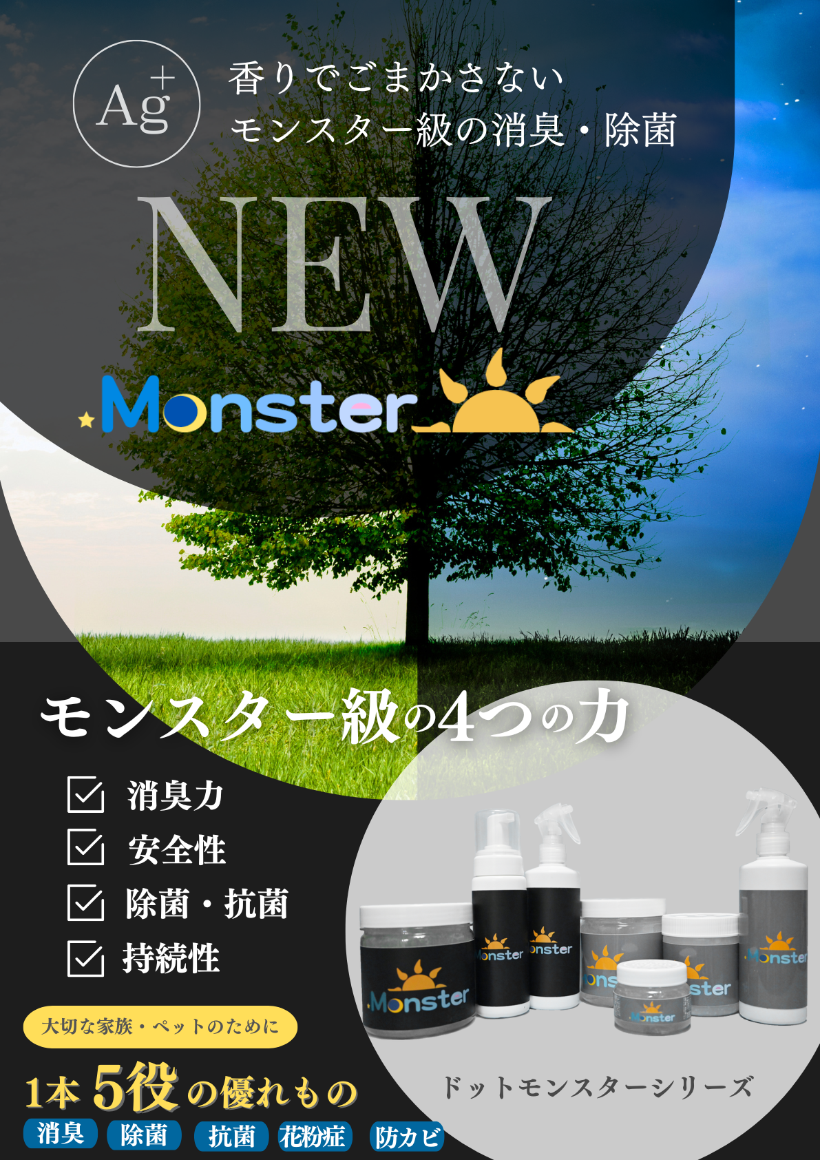 .Monstrerの成分である「銀イオン」Ag+は、高濃度の銀イオンAg+で長時間効果を持続、安全で自然環境にもやさしい製品です