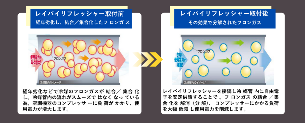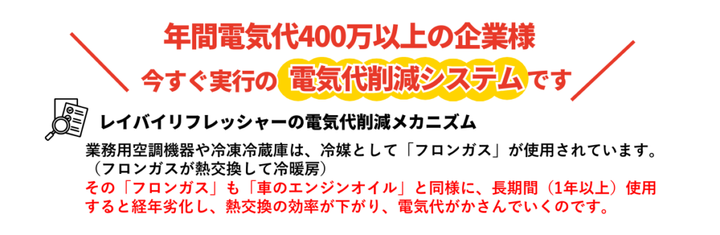 レイバイリフレッシャー効果で空調・冷蔵冷凍機器の使用電力削減により、全体の電気使用料金を10%~20%削減